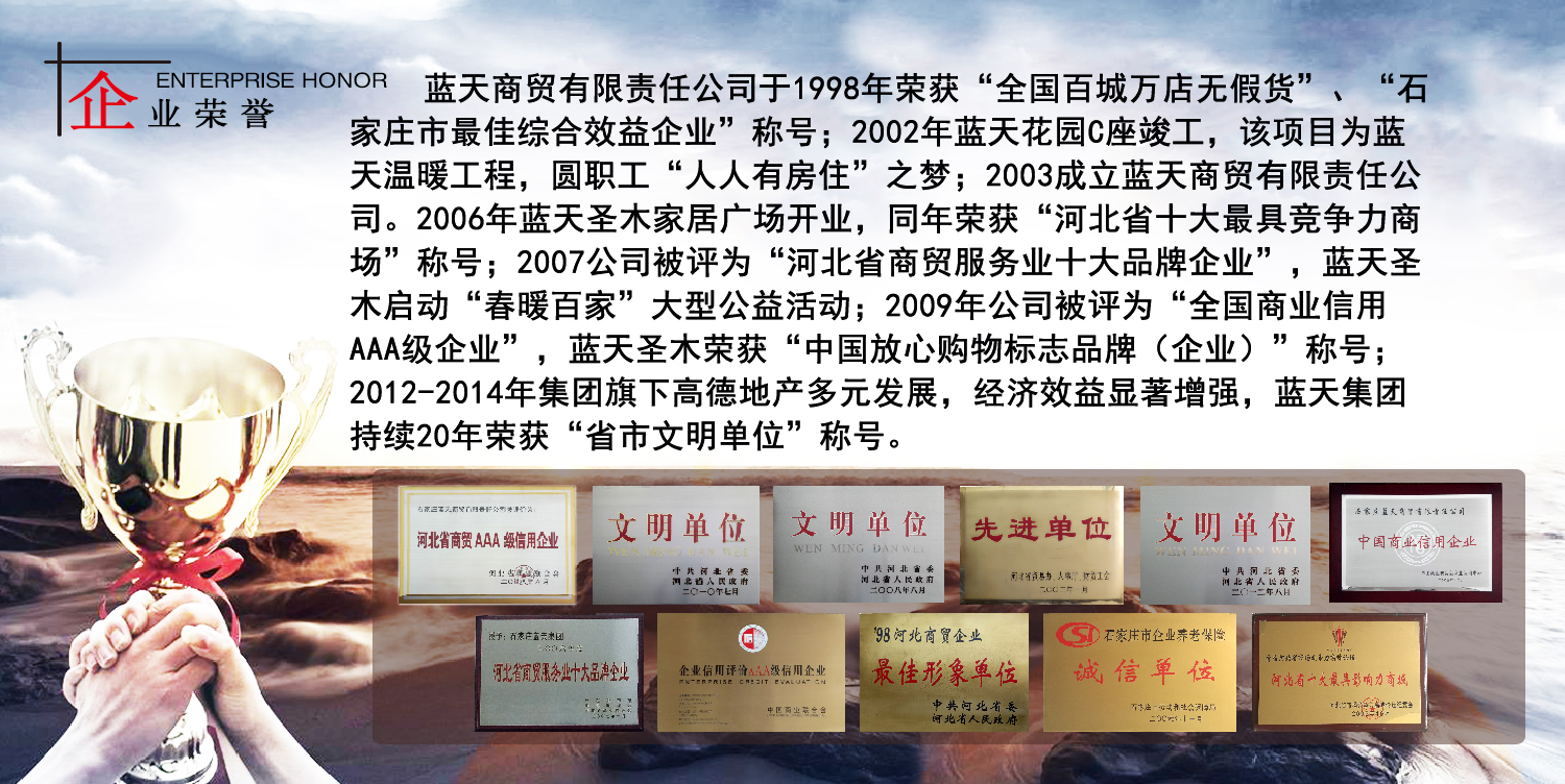 石家莊藍(lán)天商貿(mào)有限責(zé)任公司,成立于1992年10月28日,前身是石家莊長(zhǎng)安五交化公司,目前旗下包含藍(lán)天圣木家居廣場(chǎng)、藍(lán)天奧特萊斯、藍(lán)天五交化商場(chǎng)、藍(lán)天高德房地產(chǎn)4家子公司。 藍(lán)天圣木家居廣場(chǎng)是省會(huì)大型中高檔家居賣場(chǎng)之一,賣場(chǎng)經(jīng)營(yíng)面積3萬(wàn)多平方米,位于省會(huì)黃金地段,是省會(huì)重...
